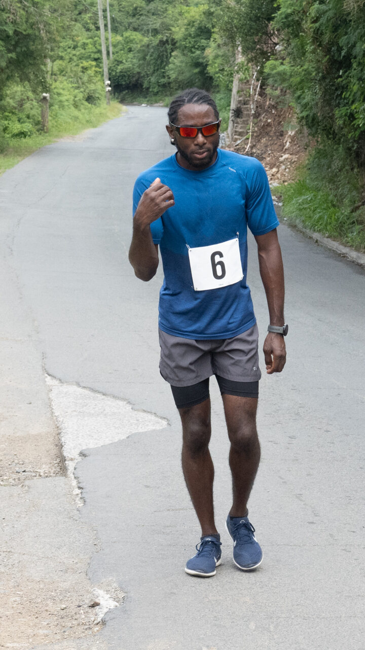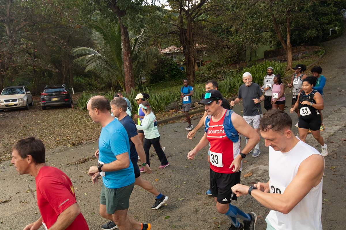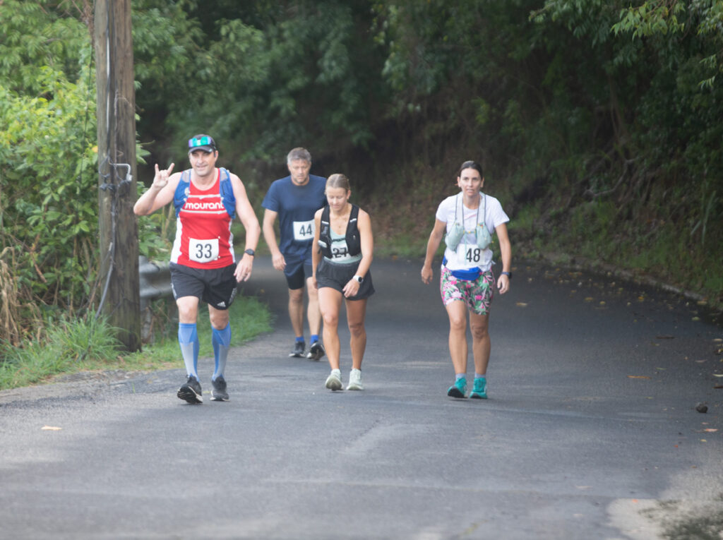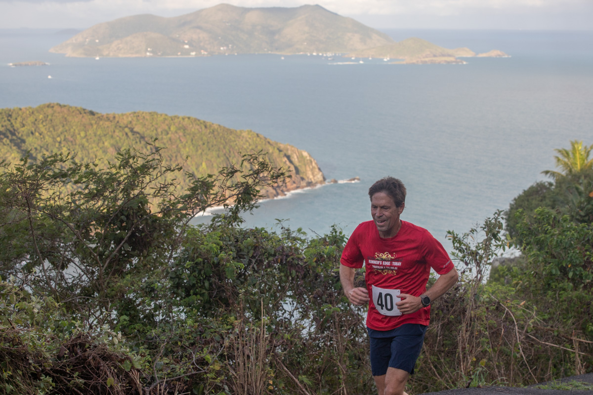 Overcast conditions and rain met the 22 runners. The cool weather helped with the brutal climb out of Brewer’s Bay, but the rain made for treacherous conditions on the descent especially in the closing stages on the final descent to Brewer’s Bay. This resulted in some slowmo sprint finishes to the finish line at the beach.